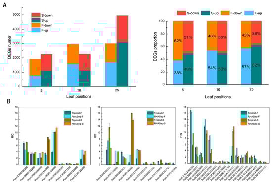 Transcription profile of differentially expresssed genes (DEGs) and real-time polymerase chain reaction (RT-PCR) validation. (A) The numbers and proportions of upregulated and downregulated genes in the 5th, 10th, and 25th leaves of triploid-F and triploid-S plants; (B) RT-PCR verification of randomly selected DEGs in the 5th, 10th, and 25th leaves of triploid-F and triploid-S plants.