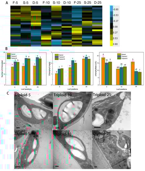 Chlorophyll synthesis and degradation in triploid-F, triploid-S and diploid plants. (A) Differentially expressed genes (DEGs) involved in chlorophyll synthesis and metabolism at different leaf canopy positions when triploid-F and triploid-S plants were compared to diploid plants; (B) The number of chloroplasts, chlorophyll content and chlorophyllase activity in triploid-F, triploid-S and diploid plants, different lowercase letters represent significant differences at p < 0.05; (C) Chloroplast ultrastructure in the 5th, 10th and 25th leaves in allotriploid and diploid plants. Bar = 10 μm.