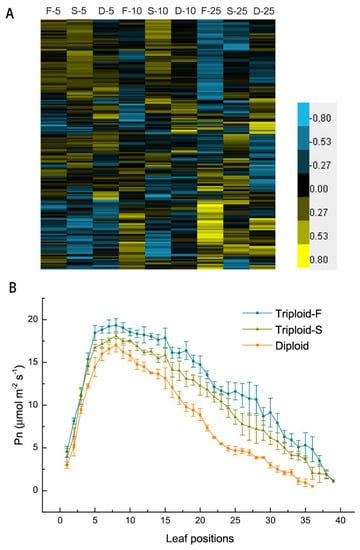 Photosynthesis in in triploid-F, triploid-S and diploid plants. (A) Differentially expressed genes (DEGs) involved in light reaction and carbon fixation on different leaf canopy positions when triploid-F and triploid-S plants were compared to diploid plants; (B) Net rates of photosynthesis on various leaf canopy positions in triploid-F, triploid-S plants and diploid plants.