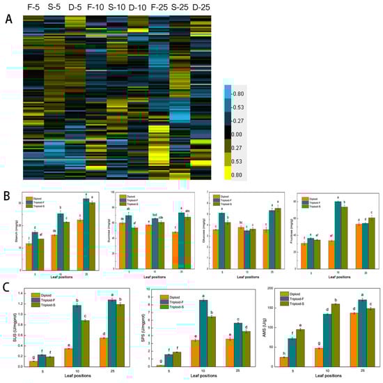 Starch and sucrose synthesis and metabolism in triploid-F, triploid-S and diploid plants. (A) Differentially expressed genes (DEGs) associated with sucrose and starch synthesis and metabolism on different leaf canopy positions when triploid-F and triploid-S plants were compared to diploid plants; (B) Starch, sucrose, glucose and fructose content on different leaf canopy positions when triploid-F and triploid-S plants were compared to diploid plants; (C) SUS, SPS, and AMS enzyme activity on different leaf canopy positions when triploid-F and triploid-S plants were compared to diploid plants. Different lowercase letters represent significant differences at p < 0.05.
