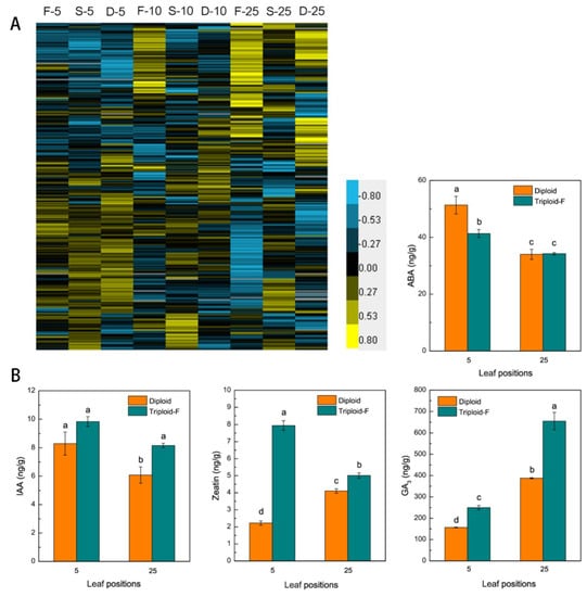 Hormone biosynthesis genes causing the upregulation of hormone in triploids. (A) Differentially expressed genes (DEGs) involved in plant hormone signal transduction on different leaf canopy positions when triploid-F and triploid-S plants were compared to diploid plants; (B) IAA, ZT, GA3 and ABA content in the 5th and 25th leaves of triploid-F and diploid plants. Different lowercase letters represent significant differences at p < 0.05.