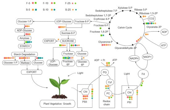 In this study, the same cultivation environment and sampling time were used for both triploid and diploid plants. When the diploid was used as a control, the DEGs from triploid-F and triploid-S were different, and so were the DEG sets from various leaf canopy positions in triploids (Figure S2). Only 6.3–47.2% of genes showed a dosage effect on pathways directly related to vegetative growth (Table S4). The DEGs related to chlorophyll synthesis, photosynthesis, and sucrose and starch synthesis and metabolism in different leaves of triploid plants showed several discrepancies (Figure 6). For example, LHCA2 and LHCA6 showed upregulated expression in the 5th leaves and no difference in the 10th leaves, and LHCA2 had downregulated expression in the 25th leaves of triploid-F plants compared to diploid plants. However, LHC showed no difference in the 5th leaves and upregulated expression in the 10th leaves, and LHCA2 showed downregulated expression in the 25th leaves of triploid-S plants compared to diploid plants. These differences in gene expression dosage indicated that gene transcription in allotriploid plants had some temporal aspects and patterns. The dosage effect genes that generated the enzyme protein in the metabolic pathway depended on the product formed in the previous stage [21]. The product of the dosage effect genes was the substrate of downstream genes in the next stage of the metabolic pathway [22,23]. The temporal difference in gene expression patterns may be a kind of adaptive behavior for budgeting energy and making full use of the cellular apparatuses in the metabolic process in allotriploid Populus (Figure 7).