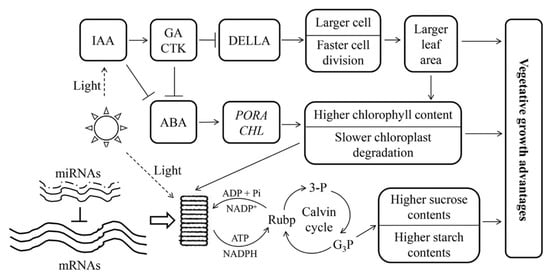 The vegetative growth advantage in polyploids is certainly related to the increased genome size [15,16]. The question raised is what is the role of increased genome size in regulating genetics during vegetative growth? Differences in gene expression changes between polyploids and diploids have been documented in many plant species [17,18]. Previous research has reported that the expression of genes related to chlorophyll biosynthesis and sucrose and starch biosynthesis and metabolism was upregulated in Arabidopsis tetraploids compared with diploids. Growth advantages in Arabidopsis tetraploid plants were related to the circadian clock. During the day, the repressors LHY (LATE ELONGATED HYPOCOTYL) and CCA1 (CIRCADIAN CLOCK ASSOCIATED1) were more inhibited in tetraploid plants than in the parents, which resulted in augmented photosynthesis and starch accumulation [2]. However, the influence of leaf position in a canopy gradient and the relationship between gene expression and miRNAs were not taken into account. Therefore, the molecular mechanisms of the vegetative growth advantage in polyploid plants require further investigation.
