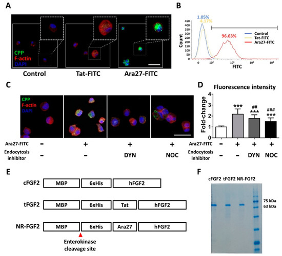 A newly developed cell-penetrating peptide (CPP), Ara27, and the purification of CPP-conjugated human fibroblast growth factor 2 (hFGF2). (A) Human dermal fibroblast (HDF) was treated with Tat-fluorescein isothiocyanate (FITC) and Ara27-FITC at 1 μM for 1 h; consequently, more Ara27-FITC than Tat-FITC enters the cells (scale bar = 50 μm, white). (B) The cell-penetrating ability of Ara27-FITC was also validated by fluorescence activated cell sorter. (C,D) The mechanism of the cell-penetrating ability of Ara27 was confirmed by dynasore and nocodazole (n > 80) (E) Control hFGF2 (cFGF2), Tat-conjugated hFGF2 (tFGF2), and Ara27-conjugated hFGF2 (NR-FGF2) were composed of maltose binding protein (MBP), his-tag for purification, CPPs, and functional hFGF2. (F) Fusion proteins were purified via Ni-NTA affinity chromatography and were analyzed by sodium dodecyl sulfate-polyacrylamide gel electrophoresis (SDS-PAGE). The results are the means of at least three independent experiments (mean + SD). *** versus the control group and ## and ### versus the Ara27-FITC-treated group.