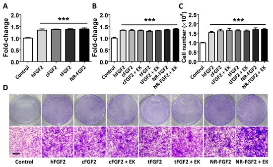In order to confirm the effect of purified CPP-conjugated hFGF2 on HDF cell growth, normal hFGF2, cFGF2, tFGF2, and NR-FGF2 were treated for five days in HDF at 1 nM before cell viability was analyzed. As a result, despite the combination of CPP and hFGF2, there was no significant difference between hFGF2 and tFGF2/NR-FGF2 (Figure 2A). In order to examine how the maltose binding protein (MBP) site of fusion proteins affects the hFGF2 activity, HDF was treated with the fusion proteins from which the MBP site was removed by EK. The cell viability and the number of the cells were significantly increased regardless of the presence of the MBP site (Figure 2B,C). Crystal Violet staining was used to confirm that the conjugation of CPP and the presence of MBP were not related to the hFGF2 activity (Figure 2D).