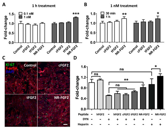 Effects of short-term treatment of NR-FGF2 on HDF. HDF was treated with cFGF2, tFGF2, and NR-FGF2 at 0.1 nM or 1 nM for 1 h and maintained for five days. (A) The proliferation of HDF significantly increased only when NR-FGF2 was treated at a concentration of 1 nM. (B) When CPP-conjugated hFGF2 was treated for 30 min, cell proliferation significantly increased only in HDF pretreated with NR-FGF2. (C) The expression of Ki-67 in the nucleus increased when NR-FGF2 was treated for a short time (scale bar = 100 μm, white). (D) Despite inhibiting the endocytosis pathway, the short-term treatment ability of NR-FGF2 was maintained. The results are the means of at least three independent experiments (mean + SD). * , ** , and *** versus the control group. ns, not significant.