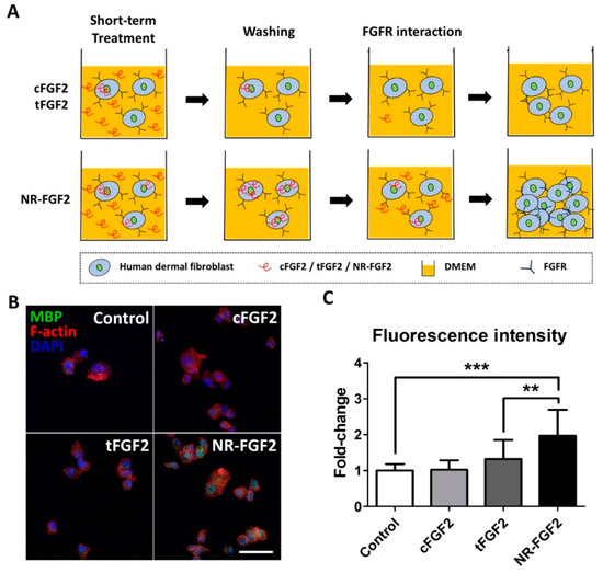 In order to explain the effects of the short-term treatment of NR-FGF2, it was hypothesized in this study, first, that the enhanced cell-penetrating ability of Ara27 increased the residence time of hFGF2 and, second, that this could continue to affect cells (Figure 4A). Therefore, after washing, hFGF2 (which had already penetrated the cells) would be released out of the medium and would interact with HDF. For confirmation, HDF was treated with CPP-conjugated hFGF2 at 1 nM for 1 h; the cell permeability of each fusion protein was then confirmed by immunofluorescence staining. MBP was used as a specific marker to detect CPP-conjugated hFGF2, since cFGF2, tFGF2, and NR-FGF2 had MBP domain. The results revealed that, during short-term treatment, more cell permeation was evident with NR-FGF2 than with cFGF2 and tFGF2 (Figure 4B,C).