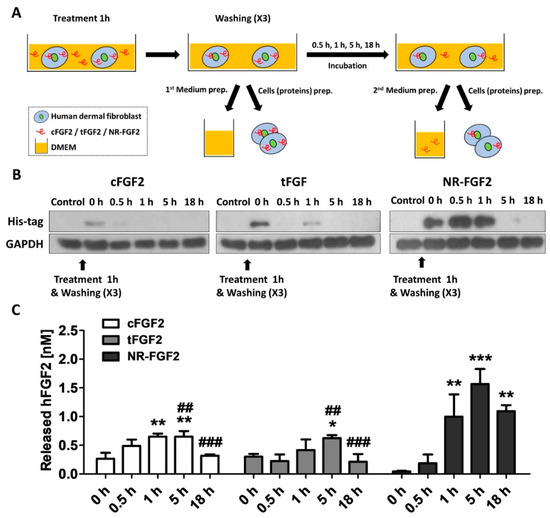 Re-release of NR-FGF2 that had penetrated HDF. (A) Experimental schematic diagram: (i) CPP-conjugated hFGF2 was treated in HDF for 1 h; (ii) after washing, the medium and cell lysate were harvested for presenting the initial (0 h) amount of hFGF2; (iii) the medium and cell lysate were obtained by culture time (0.5, 1, 5, and 18 h); and (iv) hFGF2 in the medium or cell lysate was analyzed by ELISA or western blot method, respectively. (B) NR-FGF2 remained in the cells for up to 5 h, whereas cFGF2 and tFGF2 were absent after 1 h. (C) At 1 h, NR-FGF2 was significantly re-released as compared with cFGF2 and tFGF2, and the concentration was maximized at 5 h. The results are the means of at least three independent experiments (mean + SD). * , ** , and *** versus the control group and ## and ### versus the NR-FGF2-treated group.