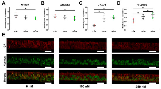 Activation of the glucocorticoid receptor (GR)-signaling pathway by cortisol in ALI-POEC. Differential marker gene expression of (A) NR3C1, (B) NR3C1α, (C) FKBP5, and (D) TSC22D3. Data are shown as mean with SD. Asterisks indicate a significant difference at p < 0.05. n = six animals. (E) Immunofluorescence staining of GR (red fluorescence) in ALI-POEC, nuclei stained with SYBR Green I; scale bar = 20 µm.