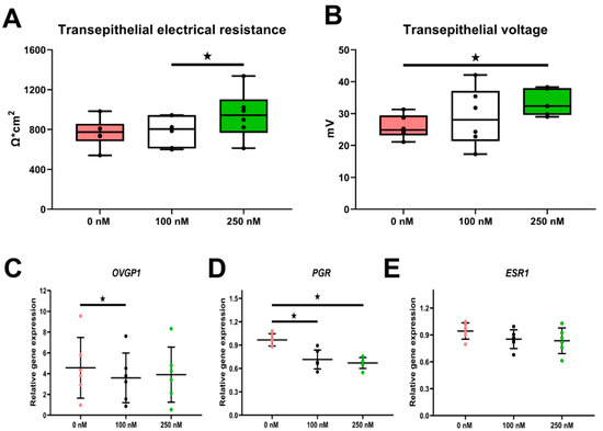Effect of cortisol stimulation on oviductal functionality parameters in ALI-POEC. Elevation of transepithelial electrical resistance TEER (A) and transepithelial voltage (B); relative mRNA abundance of (C) oviduct-specific glycoprotein 1 (OVGP1), (D) progesterone receptor (PGR), and (E) estrogen receptor 1 (ESR1). Data are shown as mean with SD. Asterisks indicate a significant difference at p < 0.05. n = six animals.
