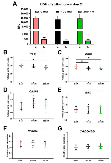 We measured lactate dehydrogenase (LDH) activity in the apical and basolateral compartments of ALI-POEC. Although the cells had been exposed to cortisol for a prolonged period of 21 days, the release of LDH protein into both compartments revealed no significant differences (p > 0.05, Figure 5A). The LDH signal in the apical compartment, in general, was stronger than the basal compartment (Figure 5A).