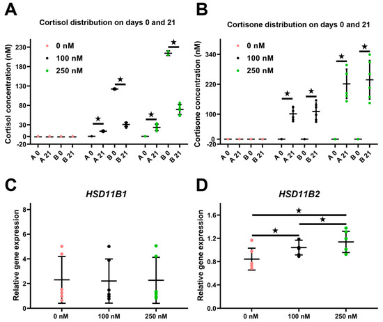 The expression of hydroxysteroid 11-beta dehydrogenase 1 (HSD11B1) and 2 (HSD11B2), the enzymes converting cortisone to cortisol and vice versa, were assessed by RT-qPCR. Cortisol treatment did not change the expression of HSD11B1 but did induce a significant dose-dependent upregulation of HSD11B2 (Figure 6C,D).