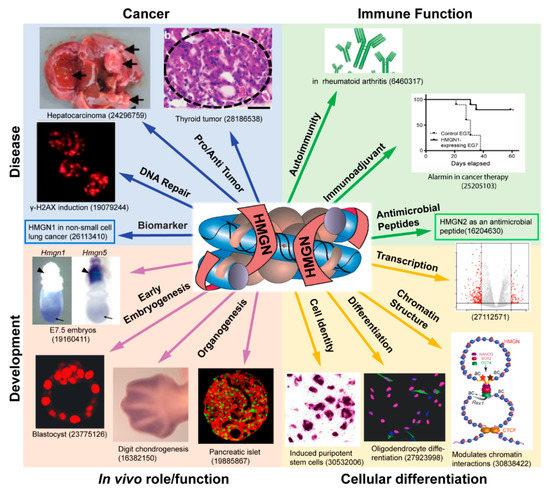 Likely, HMGNs affect the cellular phenotype by modulating epigenetic processes that affect cell type-specific gene expression [11,18], a subject of considerable interest that is not discussed here. In this review, we focus on the biological function of HMGN and summarize the available data on the role of HMGN proteins in developmental processes and in disease etiology. The two tables included in the manuscript provide a comprehensive resource for references to all the English written manuscripts on these topics that have been published in PubMed (https://www.ncbi.nlm.nih.gov/pubmed) up to December 2019.