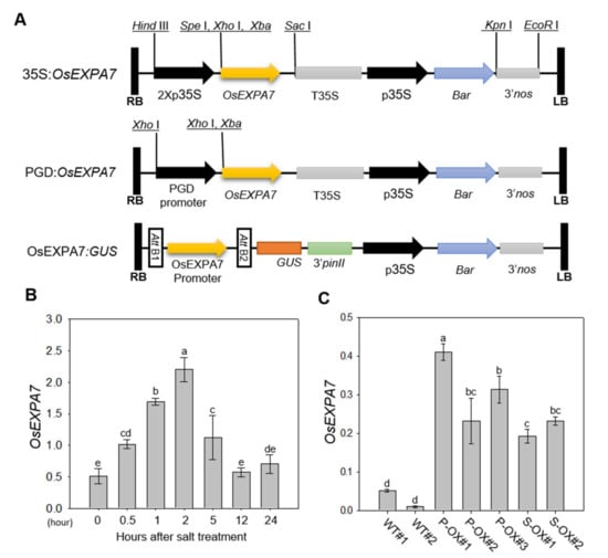To evaluate the involvement of the OsEXPA7 gene in the salt stress response, we first analyzed the expression patterns of OsEXPA7 in WT rice plants after 150 mM of NaCl treatment. Quantitative real-time polymerase chain reaction (qRT-PCR) analysis revealed that the expression level of OsEXPA7 was induced 0.5 h after salt treatment (HAT) and peaked at 2 HAT (Figure 1B). To select plants highly overexpressing OsEXPA7, we next analyzed OsEXPA7 expression levels in homozygous T3 OsEXPA7-OX lines, including 35S:OsEXPA7 (S-OX) and PGD:OsEXPA7 (P-OX). All overexpression lines exhibited a significantly higher mRNA level than WT plants (Figure 1C). Among them, the P-OX#1 and S-OX#2 lines showed the highest expression for each construct, and were, therefore, used for further analysis.