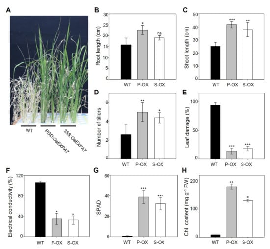 Phenotypic analysis of OsEXPA7 overexpressing rice plants for salt stress tolerance. Two-week old seedlings grown in a hydroponic solution were treated with 150 mM NaCl for analyzing salt stress response (A). Phenotypic analyses were performed by examining root length (B), shoot length (C), tiller numbers (D), leaf damage (E), electrical conductivity (F), SPAD (G), and chlorophyll content (H) of the WT plants and the two OX lines (35S:OsEXPA7 and PGD:OsEXPA7). Statistical significance was shown by a t-test (*** p < 0.001, ** p < 0.01, * p < 0.05).
