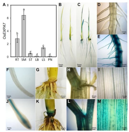 Tissue-specific spatial expression of OsEXPA7 by histochemical and qRT-PCR analyses. (A) qRT-PCR analysis of OsEXPA7 in various organs. Total RNA was extracted from the root (RT), shoot apical meristem (SM), stem (ST), leaf blade (LB), and leaf sheath (LS) of two-week-old plants and from the panicle (PN) of plants one week after heading. (B–M) WT and OsEXPA7:GUS transgenic rice plants were used for GUS analysis. GUS activity was detected in whole seedlings of WT (B) and OsEXPA7:GUS (C), root hairs of WT (D) and OsEXPA7:GUS (E), root tip of WT (F) and OsEXPA7:GUS (J), SAM of WT (G) and OsEXPA7:GUS (K), leaf sheath of WT (H) and OsEXPA7:GUS (L), and leaf blade of WT (I) and OsEXPA7:GUS (M). Different letters indicate significant differences, according to one-way ANOVA and Duncan’s least significant range test (p < 0.05). Photographs shown in (B–M) are representative images.