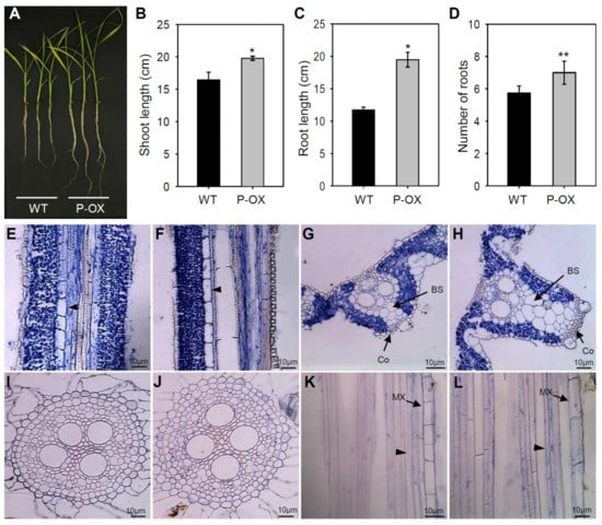 Expansins have a cell wall-loosening property that is important for many developmental and physiological processes in plants [21]. To test whether OsEXPA7 overexpression causes morphological changes in leaves and roots, we evaluated seedling phenotypes of WT and OsEXPA7-OX plants grown hydroponically, under normal nutritional conditions. The PGD:OsEXPA7#1 (P-OX#1; hereafter OsEXPA7-OX) line showed the highest OsEXPA7 expression among all OX lines and was used for further functional analysis. OsEXPA7-OX plants showed a higher biomass both in the shoot and root systems, compared with the WT plants (Figure 4A). Furthermore, we analyzed growth parameters, such as shoot and root lengths and the number of primary roots, in plants growing under control conditions. OsEXPA7-OX plants had significantly longer shoot and root lengths and higher root numbers than those of WT plants (Figure 4B–D). To evaluate cell size and shape, we prepared transverse and longitudinal sections of the leaf blades and primary roots of WT and OsEXPA7-OX lines, and examined them by optical microscopy. In longitudinal leaf sections, we observed that the metaxylem cells were much longer in OsEXPA7-OX plants compared with those in the WT plants (Figure 4E,F). In transverse leaf sections, OsEXPA7-OX plants exhibited thicker and larger veins in the leaf blade compared with the WT. Notably, a greater number of larger bundle sheaths (BSs) and collenchyma cells were observed in the large veins of OsEXPA7-OX plants compared with their WT counterparts (Figure 4G,H). Low magnification pictures are shown in Supplemental Figure S1A,B. Transverse sections of WT and OsEXPA7-OX roots showed the presence of similar sizes and numbers of cells (Figure 4I,J). However, the metaxylem cells in primary roots were longer in OsEXPA7-OX plants than those in the WT plants (Figure 4K,L). These results suggest that OsEXPA7 overexpression promotes an increase in cell size and number in the leaf and elongation of metaxylem cells in the root, which is possibly involved in cell wall loosening, and, thereby, enhances salt tolerance in OsEXPA7-OX plants.