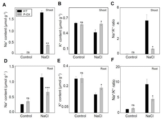 Accumulation of Na+ and K+ in wild-type and transgenic rice plants under salt stress. Na+ content (A,D), K+ content (B,E), and Na+/K+ ratios (C,F) were measured in the shoots and roots of WT and OsEXPA7-OX plants grown under 0 and 150 mM NaCl treatment for one week. Ion content was normalized with the dry weight of each sample. All the analyses of ion contents were performed with at least three biological replicates. Asterisks indicate a statistically significant difference, as determined by the Student’s t-test (*** p < 0.001, ** p < 0.01, * p < 0.05). ns, not significant.