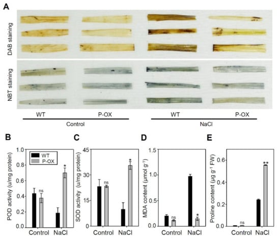 Histochemical staining and antioxidant activity in wild-type and transgenic rice plants under salt stress. (A) Detection of H2O2 and O2− by DAB (upper panel) and NBT (bottom panel) staining, respectively, in WT and transgenic seedlings. Seven-day-old plants were grown in normal medium, treated with 0 or 150 mM NaCl for 14 days, and stained as indicated. (B,C) Antioxidant activity in WT and transgenic leaves. (D,E) MDA and proline content. POD, peroxidase. SOD, superoxide dismutase. MDA, malondialdehyde. All the experiments were performed with at least three biological replicates. OsAct11 was used as a control. Asterisks indicate a statistically significant difference, as determined by Student’s t-test, (** p < 0.01, * p < 0.05). Photographs shown in A are representative images. DAB, 3,3′-diaminobenzidine; NBT, nitrotetrazolium blue chloride; MDA, malondialdehyde; ns, not significant.