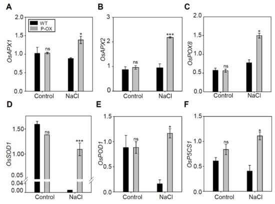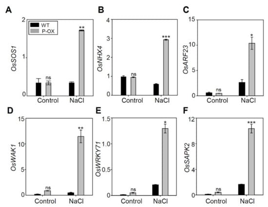 Expression of genes involved in antioxidant activity in the roots of WT and OsEXPA7-OX rice plants under salt stress. (A–F) The expression of genes involved in antioxidant activity was investigated by qRT-PCR. OsAct11 was used as a control. OsAPX1 (ascorbate peroxidase 1) (A), OsAPX2 (ascorbate peroxidase 2) (B), OsPOX8 (peroxidase 8) (C), OsSOD1 (superoxide dismutase 1) (D), OsPOD1 (peroxide dismutase 1) (E), and OsP5CS1 (F) were tested. qRT-PCR analysis was performed with at least three biological replicates. Asterisks indicate a statistically significant difference, as determined by the Student’s t-test (*** p < 0.001, * p < 0.05). ns, not significant.