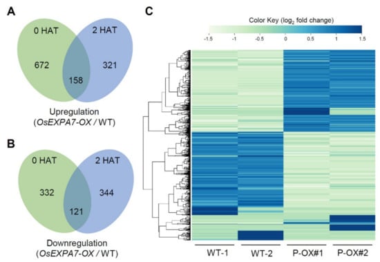 To obtain genome-wide expression data, transcriptome analysis was conducted using RNA-Seq technology for the roots of two-week-old WT and OsEXPA7-OX plants. DEG analysis showed that 672 and 321 genes were upregulated at 0 and 2 HAT, respectively, in OsEXPA7-OX plants compared to WT plants (Figure 8A). Among the upregulated genes, 158 genes were common to both 0 and 2 HAT. In contrast, 332 and 344 genes were downregulated at 0 and 2 HAT, respectively, in OsEXPA7-OX plants compared with WT plants, while 121 genes were upregulated in both (Figure 8B). The number of upregulated DEGs in OsEXPA7-OX plants was around two-fold higher at 0 HAT than at 2 HAT. However, the number of downregulated genes was similar between 0 and 2 HAT. A heatmap was constructed using data for log2 fold-change values between WT and OsEXPA7-OX plants and log2 intensities in two replicates of 944 DEGs, including upregulated and downregulated genes (Figure 8C).
