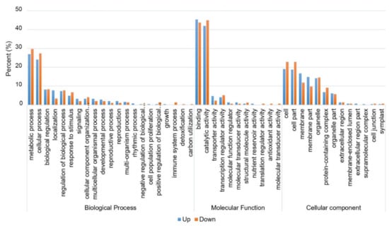 Gene ontology (GO) classification of differentially expressed genes (DEGs) under salt treatment. GO enrichment analysis for upregulated and downregulated genes after salt treatment. The results are divided into three main categories: molecular function, biological process, and cellular component. The Y-axis indicates the percentage of genes in the upregulated and downregulated categories.
