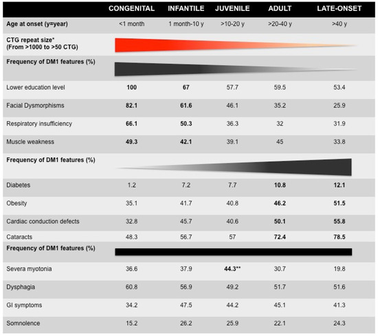 - De Antonio, M.; Dogan, C.; Hamroun, D.; Mati, M.; Zerrouki, S.; Eymard, B.; Katsahian, S.; Bassez, G. Unravelling the myotonic dystrophy type 1 clinical spectrum: A systematic registry-based study with implications for disease classification. Rev. Neurol. 2016, 172, 572–580. [Google Scholar] [CrossRef] [PubMed]