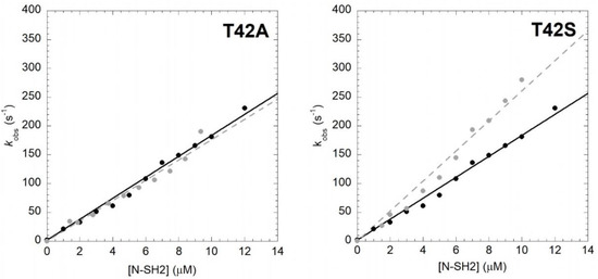 In order to unveil the effect of T42A mutation on the binding properties of the N-SH2 domain, we resorted to performing kinetic binding experiments. In analogy to our previous work [17], the binding between N-SH2 and Gab2 was measured by using a dansylated peptide mimicking the region of Gab2 ranging between residues 608 and 620 (Gab2608−620), presenting a phospho-tyrosine in position 614, which is specifically recognized by N-SH2. The binding reaction was measured by stopped-flow mixing experiments, by following the change in FRET signal occurring between residue tryptophan 6 of N-SH2 and a dansyl group covalently linked to the N-terminus of Gab2608−620. Pseudo-first-order binding experiments were performed by rapidly mixing a constant concentration of dansylated Gab2608−620 (1 μM) versus different concentrations of N-SH2 T42A, ranging from 1 to 12 μM. All traces followed a single exponential decay. A comparison between the observed rate constants obtained for N-SH2 T42A to those of the wild-type proteins at the same experimental conditions is reported in Figure 1. Both experiments were consistent with a linear dependence of pseudo-first-order kinetics. It is evident that the T42A mutation has no effect on the recognition event of Gab2608−620, the calculated kon values (kon T42A = 17.6 ± 0.6 μM−1 s−1) being very similar to the one obtained for N-SH2 wt (kon wt = 18.2 ± 0.3 μM−1 s−1).