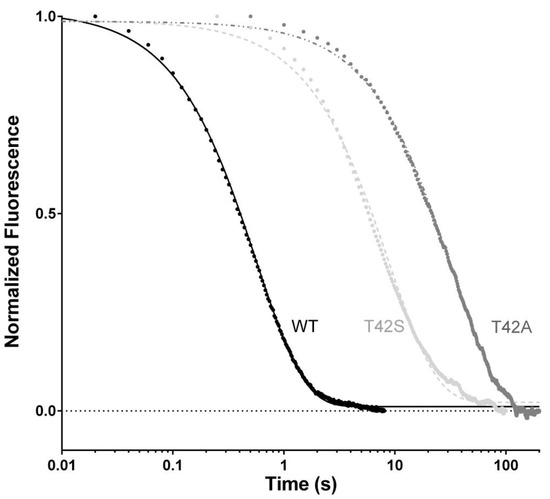 To test the effects of the T42S and T42A mutations of the structure of N-SH2, we carried out a complete folding characterization of these two variants, in comparison to the wild-type protein. In particular, we subjected the mutants to equilibrium and kinetic unfolding experiments. The experiments were carried out following the same procedures described previously for N-SH2 [17,19]. The folding and unfolding data obtained for T42S and T42A in comparison to wild-type N-SH2 are reported in Figure 3. It is evident that, whilst the T42S mutant contributes to a minor destabilization of the native state, in both cases the folding pathway is essentially unaffected by the mutations, as proved by the apparent co-operativity of the equilibrium transitions as well as by the dependence of the folding and unfolding rate constants. These findings suggest that the mutations do not significantly alter the folding of N-SH2.
