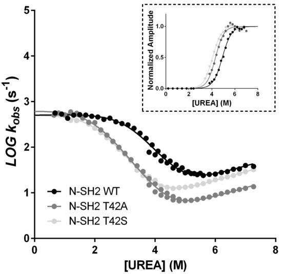 Plot of the log10 of the (un)folding observed rate constants measured at different urea concentrations for N-SH2 WT (black circles), N-SH2 T42A (dark gray circles), and N-SH2 T42S (light gray circles) measured at the stopped-flow apparatus in buffer Tris-HCl 50 mM, pH 8.0, at 25 °C. Lines represent the best fit to an equation describing a three-state folding mechanism (see text for details). Inset panel: analysis of the amplitudes obtained in unfolding experiments as a function of urea concentration. Lines are the best fit to a sigmoid equation. It is evident that the mutations contribute to a minor destabilization without significantly altering the folding of N-SH2.