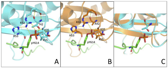 (A,B) Three-dimensional structure of the N-SH2 domain wt (in cyan) and T42A (in orange) in complex with Gab1 (in green) (PDB: 4QSY). Residues R32, K35, T42/A42, H53, and K55 are highlighted with sticks and H-bonds are represented by yellow broken lines. (C) Homology modelling of the T42A variant of the N-SH2 domain (in orange) computed with SWISS-MODEL web-based service, using PDB 4QSY as template structure (in cyan). Side-chains of T42/A42 are highlighted with sticks.