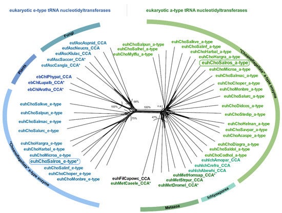 Recently, we showed in an extended phylogenetic analysis that metazoan CCA-adding enzymes originate from a horizontal gene transfer event (HGT) from Alphaproteobacteria to the common ancestor of Metazoa and their unicellular relatives, the Choanozoa [8]. In the course of evolution, the newly acquired alphaproteobacterial gene replaced the original ancestral eukaryotic gene (Figure 1B). Plants, Fungi, and Amoebozoa, however, carry the ancestral eukaryotic CCA-adding enzyme (Figure 1B). Consequently, eukaryotic tRNA nucleotidyltransferases can be subdivided into acquired alphaproteobacterial-like and ancestral eukaryotic CCA-adding enzymes (a-type enzymes, e-type enzymes), both showing characteristic differences in their catalytic core motifs [8]. Surprisingly, in the choanoflagellates Salpingoeca rosetta and Monosiga brevicollis, both an a-type as well as an e-type enzyme are encoded in their genomes. In these organisms, the original eukaryotic gene was not replaced and still exists in parallel with the alphaproteobacterial-like version [8]. In addition, representatives of the group of Fungi (e.g., Schizosaccharomyces pombe) also possess two versions of nucleotidyltransferases [35,36,37,38]. However, they are both of ancestral eukaryotic (e-type) origin [8].