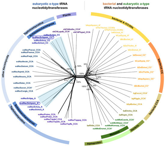 Previous studies [8,35] predicted the presence of two tRNA nucleotidyltransferases in S. pombe and recent investigations identified these enzymes as CC-and A-adding activities [37,38]. The fact that all available genomes of the genus Schizosaccharomyces encode for two candidate tRNA nucleotidyltransferases, probably with CC-and A-adding function, indicates that the S. pombe situation is not an isolated incident. The phylogenetic network clearly separates enzymes of bacterial and ancestral eukaryotic origins irrespective of their functionality (Figure 3). This indicates that (i) subfunctionalization into CC-and A-adding enzymes in S. pombe is independent of the functional diversification in Bacteria and excludes horizontal transfer of a bacterial tRNA nucleotidyltransferase gene to Schizosaccharomyces. Rather, (ii) both S. pombe CC-and A-adding enzymes are of the ancestral eukaryotic type (e-type) and are very likely the result of a gene duplication event and subsequent subfunctionalization into CC-and A-adding activity, as suggested by Reid et al. [37]. Such gene and genome duplications are not uncommon in Fungi [55]. However, the closest relatives of S. pombe, i.e., all genome-sequenced Taphrinomycotina, encode for only one enzyme. We therefore propose that (iii) the gene duplication event occurred rather recently in the common ancestor of Schizosaccharomyces, as supported by the corresponding phylogenetic network, where the two e-type enzymes of Schizosaccharomyces sp. are located at separate subtrees. Concerning topology and branch length, these subtrees are highly similar, indicating that both enzymes evolved at the same rate (Figure 3). Furthermore, the subtree topology resembles the species phylogeny of Schizosaccharomyces. Hence, these data exclude a horizontal gene transfer event and indicate an early subfunctionalization after gene duplication—an event that probably occurred in all other Schizosaccharomyces as well.