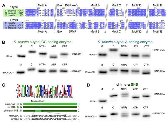 In contrast to the choanoflagellate S. rosetta, the CC-adding enzyme of the fungus S. pombe is not of bacterial but of ancestral eukaryotic origin. Nevertheless, this e-type CC-adding enzyme is also characterized by major deviations in the flexible loop consensus sequence for fungal CCA-adding enzymes, including the B/A motif located immediately upstream of the loop (Figure 5A). This B/A motif is involved in proper positioning of the tRNA 3′ end for terminal A-addition, forming hydrogen bonds to the 3’-CC terminus of the tRNA [25,27]. However, the restoration of this motif alone (RHH to RHE) is not sufficient for establishing an A-adding activity in this enzyme, indicating that additional sequence deviations restrict its activity to CC incorporation [37].