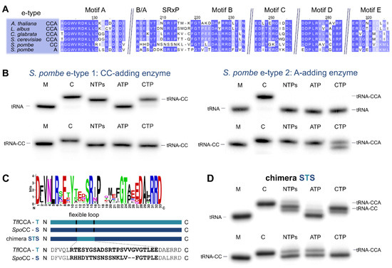The two S. pombe e-type enzymes were recently identified as the first eukaryotic pair of CC-and A-adding enzymes [37,38]. Interestingly, the S. pombe CC-adding enzyme also carries a loop sequence that differs at up to 14 residues compared to other e-type CCA-adding enzymes in the alignment, again predominantly located in the N-terminal part of the loop (Figure 5A). However, and in contrast to the S. rosetta enzyme, the tRNA 3′-end-binding B/A motif is also affected, and only the basic residue is present [25,27,37]. Restoration of this motif alone is not sufficient to restore CCA-addition in this enzyme, as recently demonstrated [37]. To investigate whether the sequence deviations in the loop element also contribute to the restricted activity of this enzyme (similar to the S. rosetta situation), we restored the B/A motif and replaced the mutated loop region of this enzyme with the corresponding element of the closely related fungal e-type CCA-adding enzyme of Taphrina flavorubra (Figure 5C). While both of the original S. pombe enzymes exhibit the expected activities of CC-and A-addition (Figure 5A,B), the Taphrina loop chimera STS added a complete CCA triplet to the tRNA substrate, as was seen with the S. rosetta SHS chimera, although at a rather low efficiency (Figure 5D, upper panel). Yet, on a substrate tRNA ending with CC, the loop chimera catalyzed efficient and specific addition of the terminal A (Figure 5D, lower panel), as was shown for loop chimeras of bacterial CC-adding enzymes [22] and the S. rosetta SHS chimera (Figure 4D). Hence, both of our loop (and B/A) insertions restored A-adding activity in the CC-adding enzymes of S. rosetta and S. pombe. To investigate whether a loop region of a more distantly related e-type enzyme is also compatible with the context of the S. pombe enzyme, we generated a chimeric protein carrying the flexible loop and the B/A motif of Saccharomyces cerevisiae. While the chimera readily incorporated two C-residues on a tRNA substrate, it completely failed to add the terminal A (Figure S2). This result corroborates our previous findings that only loop sequences of evolutionary closely related enzymes are compatible, while the corresponding region from distantly related enzymes are not exchangeable [22,24,25,33].