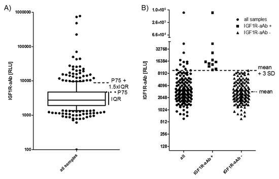 All of the available serum samples (n = 408) were analysed for the presence of IGF1R-aAb. The signals obtained (relative light units (RLU)) showed a skewed distribution (Figure 1A). Several readings were extraordinarily high (please note the logarithmic scale of the axis), indicating the presence of considerable amounts of IGF1R-aAb. As the threshold for defining positivity, two outlier criteria were applied: either the sum of the 75th percentile value (P75) plus 1.5 times the interquartile range (IQR) of all samples (P75 + 1.5 × IQR) (Figure 1A), or the sum of the mean value within the normal distribution (excluding the highest 10% of samples) plus three times the standard deviation (mean + 3SD) (Figure 1B). The procedures indicated a threshold value of 9057 RLU (4786 RLU + 1.5 × 2847 RLU, Figure 1A), and 8952 RLU (3186 RLU + 3 × 1922 RLU, Figure 1B), respectively.