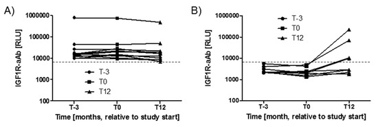Variations in IGF1R-aAb concentrations with time during the study period were analysed next. The three timepoints available from the majority of study subjects spanned 15 months, i.e., from three months before intervention (T-3), via start (T0), to the end of the twelve months study period (T12). During this time, the majority of subjects with positive IGF1R-aAb at T-3 (n = 11) remained positive for IGF1R-aAb, with notably very little change in signal strength (Figure 2A). Four subjects from the group of IGF1R-aAb negative subjects developed de novo natural IGF1R-aAb concentrations, and their samples taken at T12 surpassed the thresholds to positivity (Figure 2B), whereas the remaining subjects stayed below the threshold, i.e., were negative for natural IGF1R-aAb.