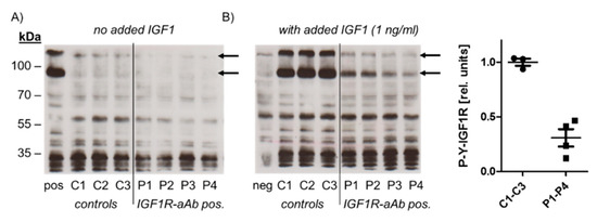 Molecular analysis of the biological activity of the IGF1R-aAb. Immunoglobulins were isolated from IGF1R-aAb negative (controls, C1–C3) and the four most positive (P1–P4) serum samples, respectively, along with an IGF1-stimulated (pos) and non-stimulated negative control (neg) sample. Cell homogenates were analyzed by Western blot for receptor activation using antibodies against Tyr-phosphorylated IGF1R (P-Y-IGF1R). (A) In the absence of the added ligand IGF1, autophosphorylation was at basal level irrespective of the added immunoglobulins. (B) IGF1R autophosphorylation was induced in the presence of added IGF1 in cells co-incubated with immunoglobulins from control sera, but only faint signals were detected from IGF1-stimulated cells in the presence of immunoglobulins from IGF1R-aAb positive sera. The arrows indicate the two major bands of phosphorylated IGF1R in HepG2 cells, and the graphic depicts the band intensities of P-Y-IGF1R after IGF1 stimulation.