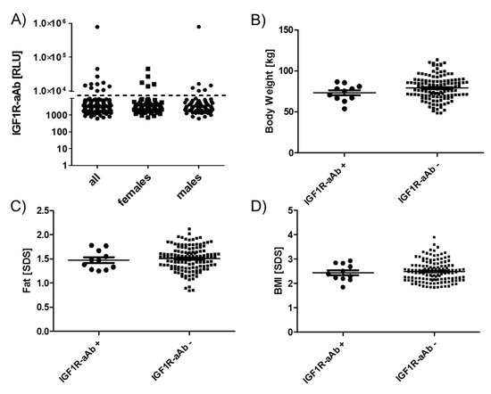 As the subjects participated in a weight reduction and maintenance trial, body weight (Figure 4B), age-adapted fat (Figure 4C) and age-adapted BMI (Figure 4D) were high in comparison to reference values, but not different between the groups of IGF1R-aAb-positive and -negative subjects. The results of body composition analysis by bioelectrical impedance analysis (bia) also revealed no significant differences between natural IGF1R-aAb-positive versus -negative subjects (not shown).