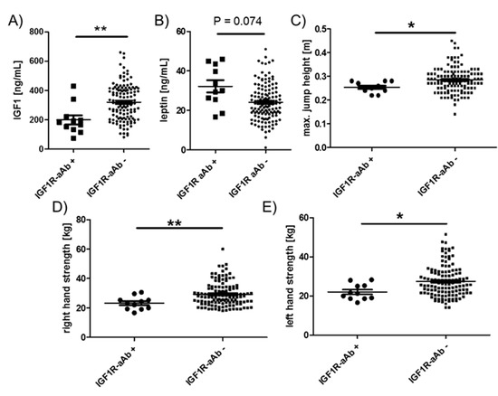 Comparison of clinical parameters related to physical strength. Study subjects were categorized as IGF1R-aAb-positive or -negative, as explained in Figure 1. The two resulting groups of subjects with or without IGF1R-aAb were compared with respect to (A) IGF1 concentrations, (B) leptin concentrations, (C) maximal jump height, as well as (D) right hand, and (E) left hand grip strengths. Analysis by two-sided non-parametric U Mann–Whitney Test; * p < 0.05, ** p < 0.01.