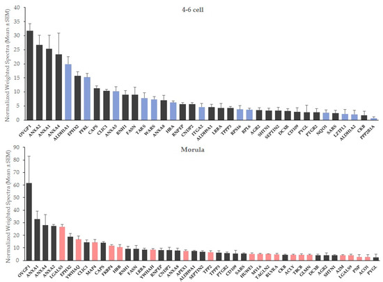 Mean abundance of embryo-interacting proteins in OF-treated embryos at the 4–6 cell and morula stages. Blue bars, proteins interacting exclusively with 4–6 cell embryos. Red bars, proteins interacting exclusively with morulas.