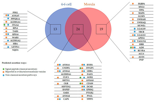 Five embryo-interacting proteins (9%) contained a signal peptide and were predicted to be secreted in a conventional way. Furthermore, 20 (36%) were predicted to be secreted by non-classical pathways. In addition, 33 embryo-interacting proteins (59%) were reported previously in oviductal exosomes (Figure 2) [9,30].