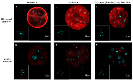 Immunolocalization of embryo-interacting proteins in OF-treated embryos (a,c,e) and controls (b,d,f). Proteins of interest are in red and nuclei are in blue. Embryos were incubated with anti-ANXA1 (a,b), anti-OVGP1 (c,d) and anti-PYGL (d,e). Inserts: controls with isotypes instead of primary antibodies.