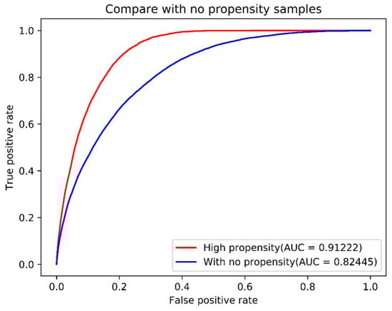 Test data sets used in this study were extremely imbalanced, so we used AUC as the main measure to evaluate the model performance on two data sets. The AUC for data set with no propensity is 0.824, while the AUC for data set with high propensity reaches 0.912 (Figure 1). We also provided accuracy and recall under different thresholds in Table S3 in the Supplementary Material.