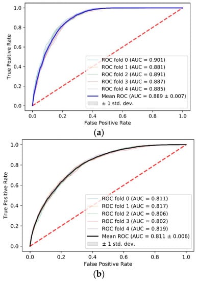 Comparison of AUC scores between data sets with high binding propensity and data sets randomly sampled. (a) ROC curve and AUC score of the high propensity data set using five-fold cross-validation; (b) ROC curve and AUC score of the random sampling data set using five-fold cross-validation. The red dotted line is a control line on which AUC = 0.5.