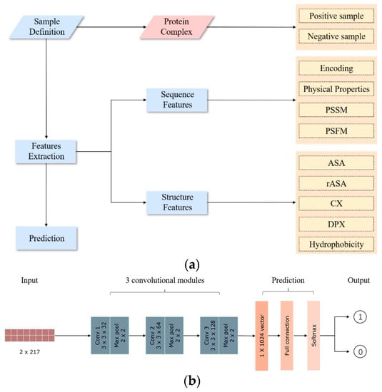 The process of prediction of PPI sites. (a) The overall flow chart for predicting pairs of interacting residues in this paper; (b) the structure of the convolutional neural network.