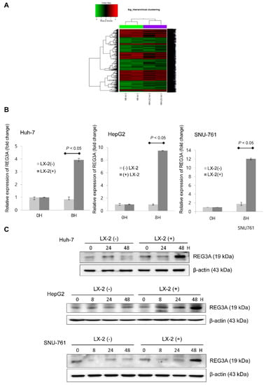 Using cDNA microarray analysis, the key molecule, REG3A, was significantly enhanced when coculturing Huh-7 cells and HSCs (+ 8.2 log) compared with monoculturing Huh-7 cells (Figure 1A). Coculturing HCC cells (Huh-7, HepG2, and SNU-761) with HSCs enhanced the mRNA (Figure 1B) and protein expressions (Figure 1C) of REG3A compared with monoculturing HCC cells.