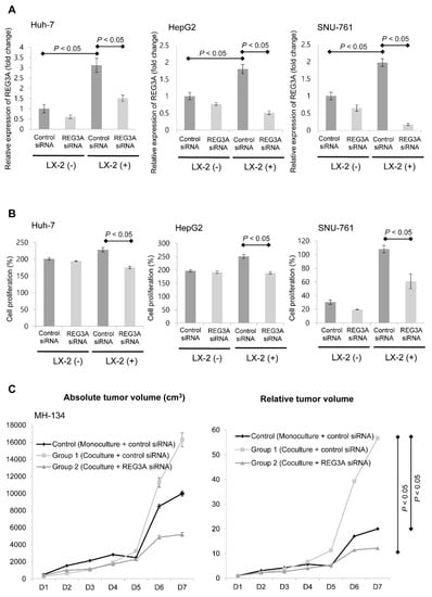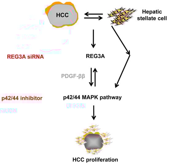 Abstract: Background: Crosstalk between tumors and their microenvironment plays a crucial role in the progression of hepatocellular carcinoma (HCC). However, there is little existing information about the key signaling molecule that modulates tumor-stroma crosstalk. Methods: Complementary DNA (cDNA) microarray analysis was performed to identify the key molecule in tumor-stroma crosstalk. Subcutaneous xenograft in vivo murine model, immunoblotting, immunofluorescence, and real-time polymerase chain reaction using HCC cells and tissues were performed. Results: The key molecule, regenerating gene protein-3A (REG3A), was most significantly enhanced when coculturing HCC cells and activated human hepatic stellate cells (HSCs) (+8.2 log) compared with monoculturing HCC cells using cDNA microarray analysis. Downregulation of REG3A using small interfering RNA significantly decreased the proliferation of HSC-cocultured HCC cells in vitro and in vivo, and enhanced deoxycholic acid-induced HCC cell apoptosis. Crosstalk-induced REG3A upregulation was modulated by platelet-derived growth factor ββ (PDGF-ββ) in p42/44-dependent manner. REG3A mRNA levels in human HCC tissues were upregulated 1.8-fold compared with non-tumor tissues and positively correlated with PDGF-ββ levels. Conclusions: REG3A/p42/44 pathway/PDGF-ββ signaling plays a significant role in hepatocarcinogenesis via tumor-stroma crosstalk. Targeting REG3A is a potential novel therapeutic target for the management of HCCs by inhibiting crosstalk between HCC cells and HSCs.