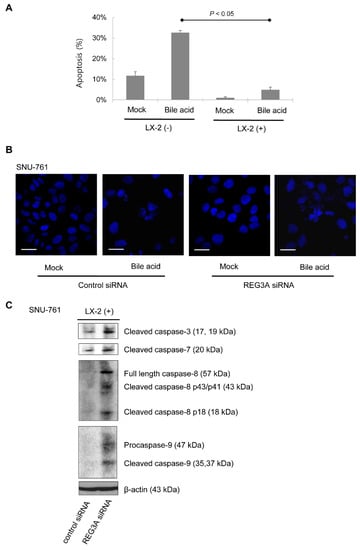 The effects of REG3A on bile acid-induced apoptosis of HCC cells cocultured with HSCs. (A) SNU-761 cells were monocultured or cocultured with LX-2. After 24 h, cells were treated with deoxycholate (300 μM) for 2 h. Apoptosis was assessed using 40,6-diamidino-2-phenylindole dihydrochloride (DAPI) staining. Data are expressed as mean ± SD from three different experiments (p < 0.05, vs. mono-culturing without LX-2). The experiment was repeated three times. (B) On fluorescence microscopy, SNU-761 cells cocultured with LX-2 cells were significantly more resistant to bile acid (deoxycholic acid 300 μM)-induced SNU-761 cell apoptosis compared with monocultured cells. Scale bars, 50 μm. (C) Immunoblot analyses of caspase 3, 7, 8, and 9 were performed in SNU-761 cells cocultured with LX-2 cells. The experiment was repeated three times.