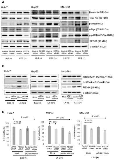 The immunoblot assay results showed downregulation of REG3A caused by siRNA transfection decreased the expression of phosphorylated p42/44 (p’-p42/44), especially when HCC cells were cocultured with HSCs (Figure 4A). When HCC cells were treated with p42/44 inhibitor (PD98059, 10 μM), the protein expression of REG3A significantly decreased compared with control (Figure 4B). Results of densitometric analysis are presented as the relative ratio of REG3A to β-actin (Figure S1).